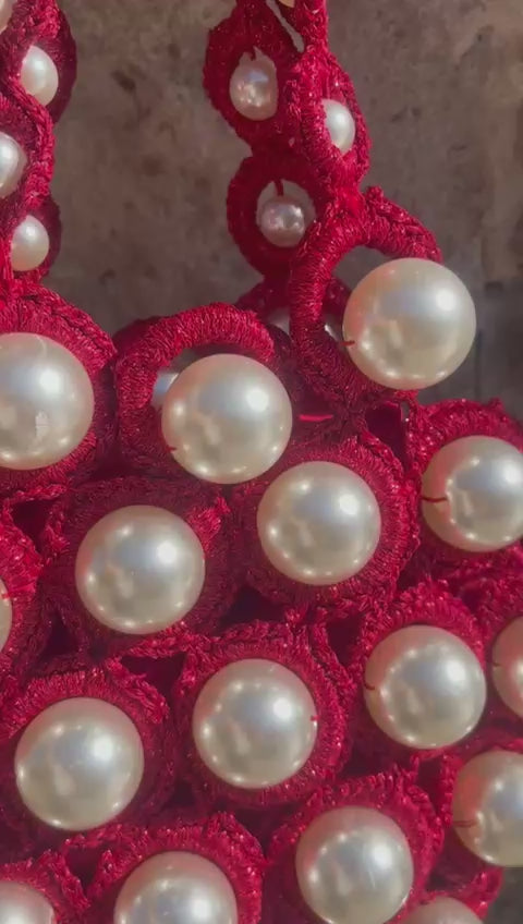 Ogni nodo custodisce una grande perla decorativa, che crea un effetto elegante e tridimensionale. Il manico, anch’esso intrecciato e impreziosito da perle.